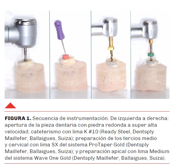 El tratamiento de la muestra comenzó con la apertura, empleando piedras y fresas acordes al tamaño de cada pieza dentaria. Luego se realizó cateterismo con lima K #10 (Ready Steel Dentsply Maillefer, Ballaigues, Suiza), pre-ensanche cervical con limas K #15, 20 y 25 (Ready Steel Dentsply Maillefer, Ballaigues, Suiza) y el ensanche del tercio medio y cervical con lima SX del sistema Protaper Gold (Dentsply Maillefer, Ballaigues, Suiza). Una vez preparado el tercio cervical, se realizó la conductometría con localizador apical (Woodpex III, WoodPecker, Guangxi, China) y corroboración radiográfica, con radiovisiógrafo (5200 Carestream, Atlanta, Estados Unidos). Seguido a esto, se procedió a realizar la instrumentación secuencial con limas Small, Primary y Medium de Wave One Gold (WOG) (Dentsply Maillefer, Ballaigues, Suiza) (Figura 1). La lima apical maestra (LAM), que es la última lima de instrumentación que llega hasta la longitud de trabajo, fue la Medium de WOG (Dentsply Maillefer, Ballaigues, Suiza) (Figura 1). Entre cada una de la secuencia de limas se irrigó con 10 ml de hipoclorito de sodio al 2,5%, el anteúltimo lavaje se realizó con 5 ml de EDTA 17% (Tedequim, Córdoba, Argentina) y en el último lavaje se usó nuevamente hipoclorito de sodio al 2,5%. Se llevó a cabo la activación durante 1 minuto del anteúltimo y último lavaje con activador sónico 35.04 (Endoactivator Dentsply Sirona, Ballaigues, Suiza) y, por último, se secó con conos de papel estériles (Meta Biomed, República de Corea).