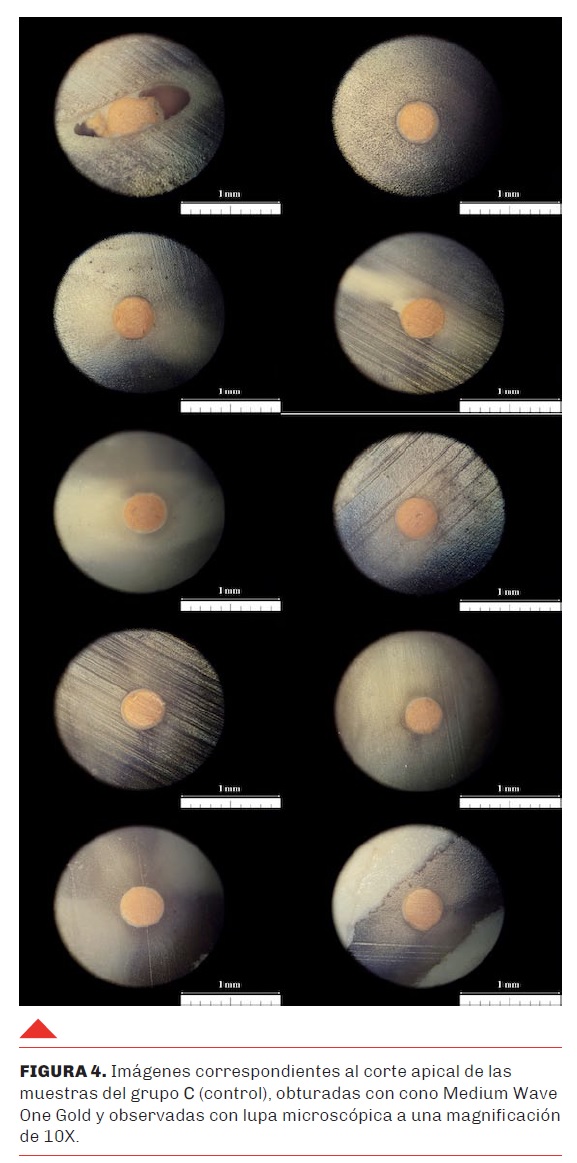 Una vez realizada la preparación químico-mecánica se dividió la muestra de forma aleatoria en 3 grupos (A, B y C). El cemento sellador empleado para los 3 grupos fue Ad Seal (Meta Biomed, República de Corea). Los grupos A y B fueron obturados con técnica de condensación lateral en frío y el grupo C fue obturado con técnica de cono único. Para el grupo A se empleó cono principal de conicidad .04 (Meta Biomed, República de Corea) y en el grupo B se usó un cono principal de conicidad .02 (Meta Biomed, República de Corea). Finalmente, el grupo C fue obturado con un cono principal Medium Wave One Gold (Dentsply Maillefer, Ballaigues, Suiza). En todos los grupos los conos fueron cortados punta de ultrasonido P1 (Woodpecker, China), se eliminaron excesos camerales de gutapercha con fresa Endo Z (Dentsply Maillefer, Ballaigues, Suiza) y luego se realizó la compactación vertical en frío. Por último, se realizó la limpieza de sellador con una torunda de algodón estéril embebida en alcohol y sellado coronario con ionómero vítreo (Ionofil Plus, Voco, Alemania).