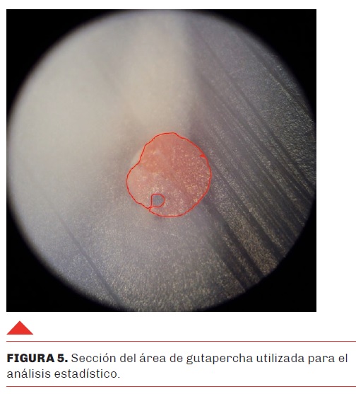 A. Área ocupada por la gutapercha (mm2): porcentaje del área ocupada por la gutapercha sobre el área total del conducto (Figura 5).