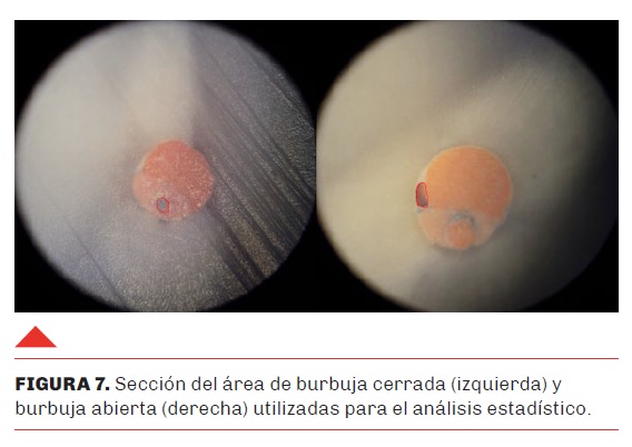 C. Áreas vacías (mm2): porcentaje del área ocupada por espacios vacíos sobre el área total del conducto. Estas áreas vacías pueden ser cerradas, lo que implica que se encuentran rodeadas por cemento y/o gutapercha, o abiertas, las cuales se encuentran contra las paredes del conducto, y no están encapsuladas por material. Estas áreas se denominan burbujas abiertas o cerradas (Figura 7).