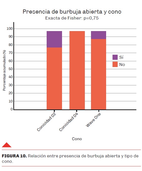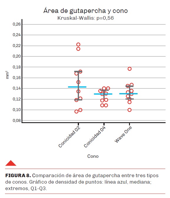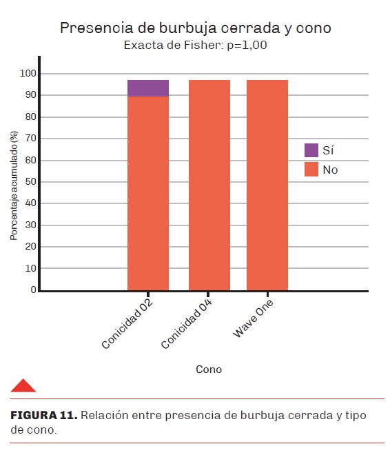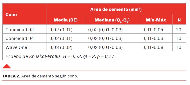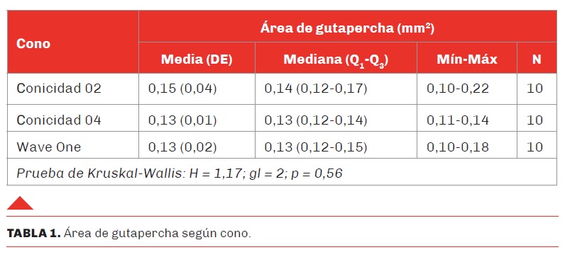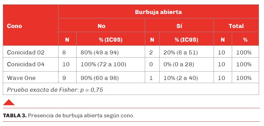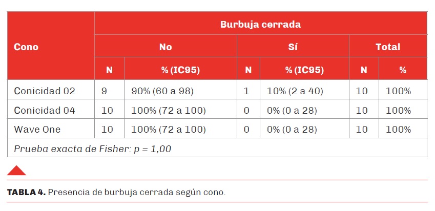 La descripción de los datos muestra pequeñas diferencias entre conos con respecto a algunas de las variables estudiadas. En particular, el área de gutapercha sería mayor con Conicidad 02 que con Conicidad 04 y Wave One. La presencia de burbujas también sería mayor con Conicidad 02. Sin embargo, estas variaciones no llegaron a ser estadísticamente significativas.