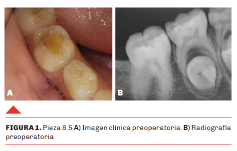 Concurrió una paciente de 8 años, refiriendo dolor espontáneo y pulsátil en el segundo molar inferior primario derecho (8.5). A la inspección clínica se observó una restauración con microfiltración marginal (Figura 1a). La radiografía periapical evidenció radiolucidez coronal compatible con lesión secundaria de caries, el molar presentaba mínima reabsorción radicular fisiológica (Figura 1b). Tras las pruebas realizadas se estableció como diagnóstico pulpitis irreversible.