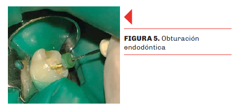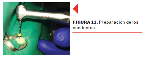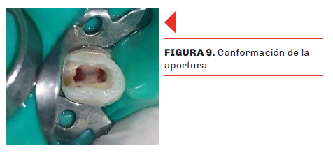 Se arribó a un diagnóstico de pulpitis irreversible y se procedió a realizar la pulpectomía. Se colocó anestesia troncular y aislamiento absoluto de la pieza 8.4. Se eliminó el tejido cariado y el techo de la cámara pulpar, se conformó la apertura y se extirpó la pulpa inflamada (Figura 9). Luego, se constató la permeabilidad de los conductos con una lima K 10 (Dentsply-Maillefer, Suiza). La longitud de trabajo se determinó radiográficamente a 1mm del ápice (Figuras 10). Para la preparación de los conductos se utilizó el sistema ProTaper Universal (Dentsply-Maillefer, Suiza) (S1-S2-F1) en un motor endodóntico CanalPro CL (Coltene, Alemania) (Figura 11). La instrumentación mecánica se combinó con el uso de hipoclorito de sodio al 1% y EDTA al 17% (Dickinson, Argentina). Finalmente, los conductos se obturaron con pasta lentamente reabsorbible de Maisto (Klepp, Argentina) y se colocó IRM (Dentsply) como obturación provisoria. La radiografía postoperatoria mostró una óptima obturación de los conductos (Figura 12). A los 7 días el diente se restauró en forma definitiva con una corona de acero inoxidable de laboratorio, cementada con ionómero de vidrio (Ketac Cem, 3M ESPE, Alemania) (Figura 13). A los 3 meses se realizó un control clínico-radiográfico, con buena evolución (Figura 14). Luego de 18 meses el paciente regresó para control, habiendo exfoliado la pieza 8.4 en forma natural, al igual que su contralateral (Figura 15). La pieza sucesora (4.4) erupcionó correctamente.