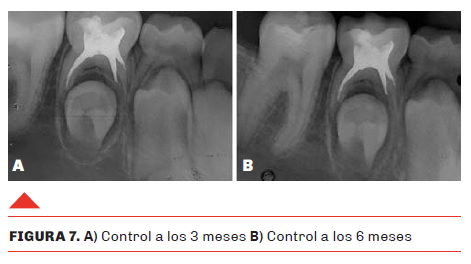 Se decidió implementar el tratamiento de pulpectomía de la pieza 8.5, se administró anestesia regional, se realizó aislamiento absoluto, la remoción de la restauración preexistente, la eliminación del tejido cariado y apertura de la cámara con piedra redonda y luego con fresa Endo Z (Dentsply, Sirona®) para rectificar el diseño (Figura 2). Se realizó el cateterismo con una lima tipo K 10 de 21 mm (Dentsply, Sirona®). A continuación, se irrigó con hipoclorito de sodio al 1%, se realizó la preparación de accesos del sistema y luego se determinó la longitud de trabajo en forma radiográfica (Figuras 3). Los conductos se instrumentaron hasta la longitud establecida con sistema NiTi HyFlex™ CM con motor Endo Radar Pro (Woodpecker) alternando con irrigación con NaOCl 1% entre cada pasaje de lima, última irrigación EDTA 17% (Dickinson, Argentina) (Figura 4). Para la obturación de los conductos radiculares se utilizó pasta lentamente reabsorbible de Maisto (Klepp, Argentina) (Figura 5). Posteriormente, se restauró con resina compuesta (Figura 6a). La radiografía posoperatoria evidenció la obturación uniforme de todo el sistema de conductos (Figura 6b). El control clínico-radiográfico a 3 y 6 meses fue favorable sin signos ni síntomas de infección (Figuras 7a y 7b).