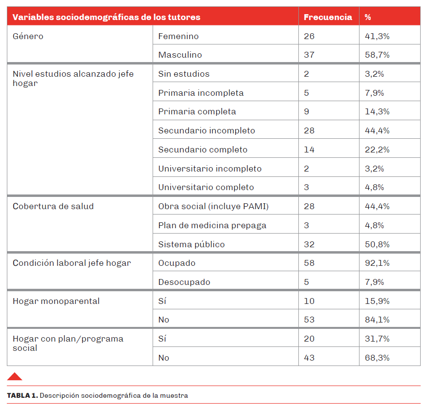 En cuanto al análisis socioeducativo de los tutores (n = 63) que respondieron ambas modalidades el 50,8 % presentó cobertura de salud pública, el 15,9% de los hogares eran monoparentales y el 31,7 % recibía un plan o programa social. En cuanto al nivel educativo alcanzado por los tutores legales se pudo observar que un mayor porcentaje de estos habían accedido a la educación secundaria, el 22,2% completó los estudios y el 44,4% presentó secundario incompleto (Tabla 1).