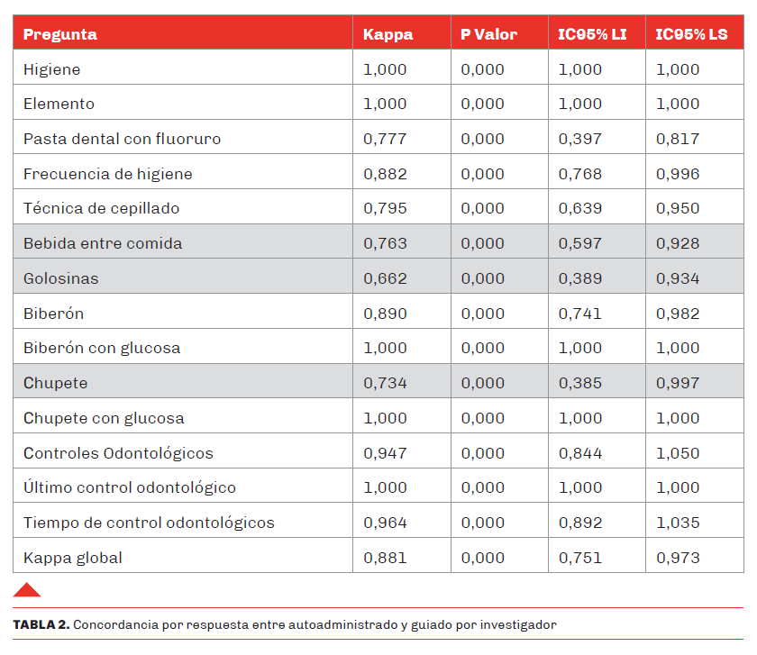 En cuanto a la concordancia entre las respuestas de las dos modalidades de administración se obtuvo un índice de Kappa global de 0,881; de las cuales 11 del total de las respuestas presentaron un índice Kappa alto > 0,77 y solo 3 presentaron un índice de Kappa moderado observándose en las preguntas: consume golosinas Kappa de 0,662, usa chupete Kappa 0,734 y consume bebidas azucaradas entre comidas Kappa 0,763 (Tabla 2).