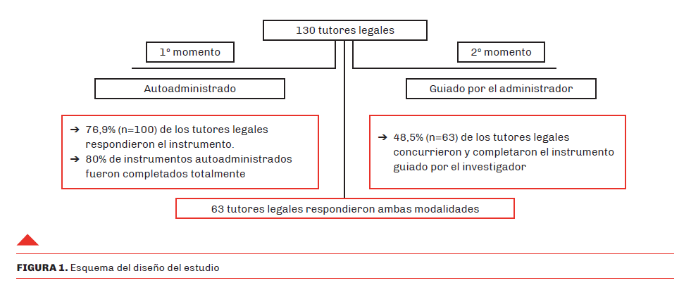 Para la modalidad autoadministrada se evaluó el porcentaje de instrumentos que fueron respondidos por los tutores legales y el porcentaje de instrumentos autoadministrados, completados totalmente. En la modalidad guiada por un investigador, se registró el número de concurrentes que habían completado el cuestionario.