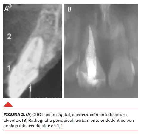 A los 40 días, luego de la cicatrización de la lesión ósea y previo al retiro de la férula se realizó el tratamiento endodóntico definitivo del 1.1 y colocación de un anclaje intrarradicular (Figura 2 A y B), para así comenzar la extrusión ortodóncica lenta y volver el trazo de fractura supragingival, restablecer el espacio biológico y conseguir una adecuada adaptación de los márgenes de la restauración.