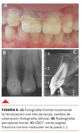 Al momento del examen clínico se observó: ferulización con hilo de tanza que involucraba las piezas 1.2, 1.1, 2.1 y 2.2, cambio de coloración y apertura endodóntica comunicada al medio bucal en 1.1 (Figura 8 A). En la radiografía periapical se evidenció formación radicular completa, radiolucidez apical y una línea de fractura no precisa en el 1.1, por lo cual se solicitó una tomografía computarizada de haz cónico (CBCT) en cortes de 1 mm, que confirmó la existencia de fractura corono-radicular (Figura 8 B y C). En la consulta de urgencia se realizó el tratamiento endodóntico obturando mediante la técnica de condensación lateral con conos de gutapercha y sellador endodóntico y se cementó un poste de fibra de vidrio con el objetivo de unir los cabos de fractura para mantener la misma corona dentaria adherida y luego retirar la férula (Figura 9 A, B y C).