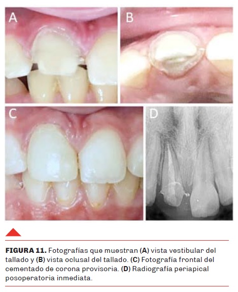 Debido a la posición subgingival de la fractura en palatino, se planificó realizar la extrusión ortodóncica rápida. Se cementaron brackets 0° en las piezas 1.2, 1.1 y 2.1 con técnica directa. El brackets del 1.1 se colocó hacia gingival del centro de la corona clínica, la diferencia de altura representa la extrusión buscada. Se utilizó un arco seccional de acero inoxidable de .016” x .025” y una cadena elastomérica para traccionar y extruir el 1.1 (Figura 10 A). Semanalmente, se realizó la activación, acompañada con fibrotomía circunferencial supracrestal para permitir que el margen gingival y el hueso permanezcan más estables (Figura 10 B). En el periodo de 1 mes se logró la extrusión requerida. Luego de un periodo de estabilización de 8 semanas, se realizó el tallado y una corona provisoria de acrílico para posteriormente restaurar en forma definitiva con corona de composite microhíbrido fotopolimerizable de laboratorio (Figuras 11 y 12).