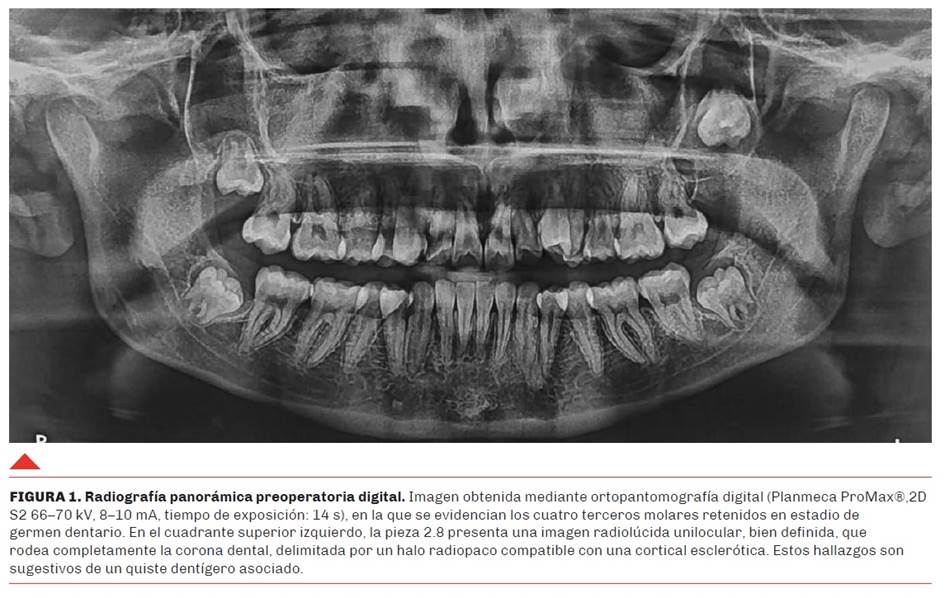 Introducción: El quiste dentígero es una de las lesiones odontogénicas de desarrollo más frecuentes, clasificada por la Organización Mundial de la Salud como un quiste epitelial de origen odontogénico. Se asocia a dientes no erupcionados, en especial terceros molares mandibulares y caninos superiores, y suele diagnosticarse de forma incidental en estudios radiográficos. Objetivo: Describir las características clínicas, imagenológicas, histopatológicas y terapéuticas del quiste dentígero, integrando evidencia actualizada y presentando un caso clínico. Materiales y métodos: Se realizó una revisión narrativa de la literatura reciente, incluyendo estudios clínicos, revisiones sistemáticas, reportes de caso y documentos de clasificación internacional, con énfasis en artículos publicados entre 2015 y 2025 y se presenta un caso clínico tratado según la evidencia científica. Desarrollo: Los reportes de la literatura indican que el quiste dentígero presenta una predilección por pacientes jóvenes, siendo generalmente asintomático. Radiográficamente, se manifiesta como una lesión radiolúcida unilocular bien delimitada que rodea la corona de un diente impactado. Su diagnóstico diferencial incluye entidades como el queratoquiste odontogénico y el ameloblastoma. El tratamiento estándar es la enucleación quirúrgica con extracción dentaria; sin embargo, en pacientes pediátricos, la marsupialización puede favorecer la erupción del diente asociado. En lesiones extensas o con compromiso de estructuras anatómicas, se consideran abordajes quirúrgicos combinados. El manejo del quiste dentígero requiere un enfoque integral que combine la evaluación clínica, radiológica e histopatológica. El uso de herramientas como la CBCT optimizan el tratamiento y reducen la morbilidad. A continuación de la revisión de la literatura, se presenta el caso de una chica de 13 años, que en radiografía panorámica indicada para evaluar la presencia de molares retenidos, se identifica una imagen radiolúcida que luego de estudios tomográficos y análisis anatomopatológicos fue diagnosticada como un quiste dentígero.
