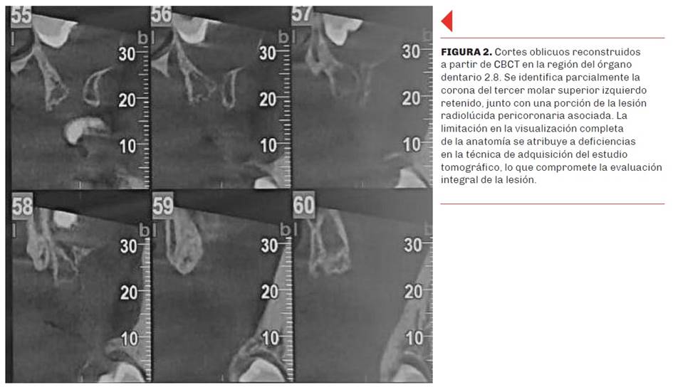 La paciente se encontraba asintomática, por lo que el hallazgo fue incidental y radiográfico. Dada la limitación inherente a las imágenes bidimensionales obtenidas por ortopantomografía —como la superposición de estructuras y la falta de información en profundidad— se indicó la realización de una tomografía computarizada de haz cónico (CBCT), la cual fue efectuada en otro centro. La imagen volumétrica permite una mejor caracterización de la lesión. La CBCT es una herramienta complementaria invaluable en el diagnóstico y planificación quirúrgica. Proporciona imágenes tridimensionales detalladas que permiten una evaluación precisa de la extensión de la lesión, la relación con estructuras anatómicas adyacentes y la planificación de abordajes quirúrgicos menos invasivos.