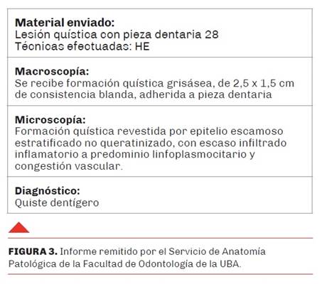 Desde el Servicio de Cirugía Oral y Maxilofacial se llevó a cabo la enucleación completa de la lesión quística, acompañada de la exodoncia del tercer molar superior asociado. Esta decisión se fundamentó en la posición ectópica y el grado de desarrollo del diente, que contraindican su reposicionamiento mediante terapia ortodóncica. Debido a que la lesión no comprometía el seno maxilar, el abordaje quirúrgico se realizó mediante la técnica convencional intraoral. El diagnóstico de quiste dentígero fue confirmado a través del análisis histopatológico de la muestra (Figura 3). Adicionalmente, ante la presencia de sacos pericoronarios ensanchados en los terceros molares retenidos restantes, se optó por su extracción profiláctica con el fin de prevenir posibles complicaciones y mejorar el pronóstico a largo plazo.