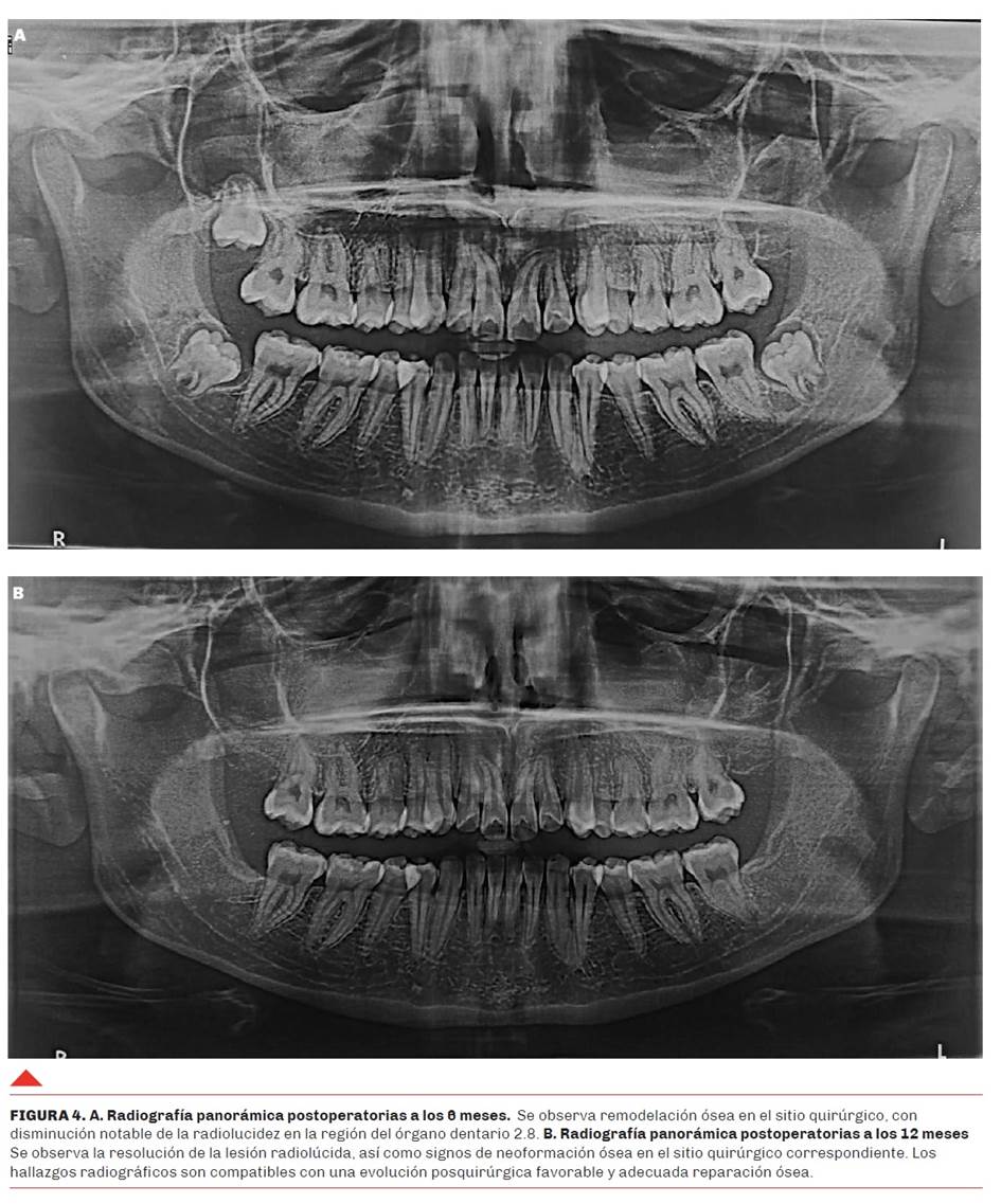 Se solicitaron radiografías panorámicas postoperatorias de seguimiento a los 6 y 12 meses. Las imágenes fueron obtenidas mediante ortopantomografía digital (Planmeca ProMax® 2D S2, 66–70 kV, 8–10 mA, tiempo de exposición: 14 s) para evaluar la evolución postquirúrgica luego de la enucleación del quiste y la exodoncia del tercer molar asociado. A los 6 meses se observó una adecuada remodelación ósea en el sitio quirúrgico, con disminución notable de la radiolucidez previamente identificada en la región del órgano dentario 2.8 (Figura 4a). La imagen obtenida a los 12 meses, luego de la exodoncia de los 3 terceros molares remanentes, evidenció consolidación ósea progresiva y ausencia de signos radiográficos de recurrencia o complicaciones, confirmando la evolución favorable del caso (Figura 4b).