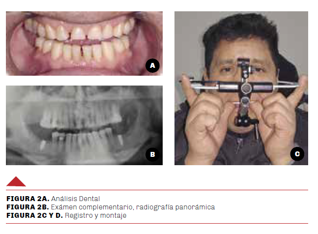 De acuerdo al análisis dental, la línea inter incisal del maxilar superior con el inferior no coincide con la línea media facial presentando la pérdida de forma y tamaño en el sector anterosuperior con pérdida gradual del color y textura como también ausencia de piezas dentarias 1.7, 2.7, 3.6, 3.7, 4.6 y 4.7, restauraciones fallidas y con endodoncia en piezas 1.5 - 1.6 - 2.6 y lesiones cervicales diagnosticadas como abfracciones en 1.4, 1.5, 2.4 y 4.5 (Figura 2A).