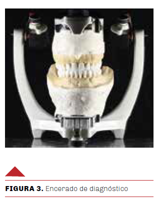 Se efectuó un primer encerado de diagnóstico tipo sustractivo. Se observó que dicho encerado llevaba a un plan de tratamiento muy invasivo y que requeriría múltiples endodoncias, con la consiguiente complejidad y costo elevado, por lo que se optó por un encerado de tipo aditivo, devolviendo forma y tamaño a las piezas dentarias con el objetivo de valorar las dimensiones que se darán a los dientes anterosuperiores y determinar la dimensión vertical próxima, devolviendo la funcionalidad y estética de las piezas dentarias (Figura 3).