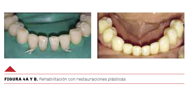 Finalizadas las restauraciones de las lesiones cervicales, se comenzó con el protocolo de la rehabilitación, con las restauraciones de inserciones plásticas directas en el sector antero inferior, devolviendo la anatomía de los bordes incisales con una llave de silicona (putty) (Zetaplusputty, Zhermack) confeccionada a partir del encerado de trabajo de las piezas dentales 3.3, 4.3, 4.2, 4.4 y 4.5, para tener una alineación y nivelación tridimensional de las piezas (Figuras 4 A y B).