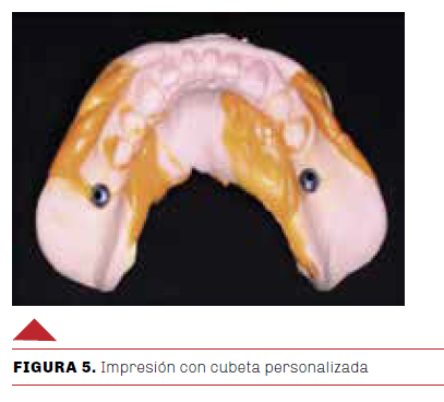 Luego se tomó una impresión con silicona por adición (Panasil PuttySoft, Kettenbach) en una cubeta personalizada hecha de acrílico autopolimerizable para transferir la posición de los implantes y la confección de los pilares personalizados sobre los implantes de las zonas 4.6 y 3.6 a partir de los transfer con tornillo pasante (Figura5).