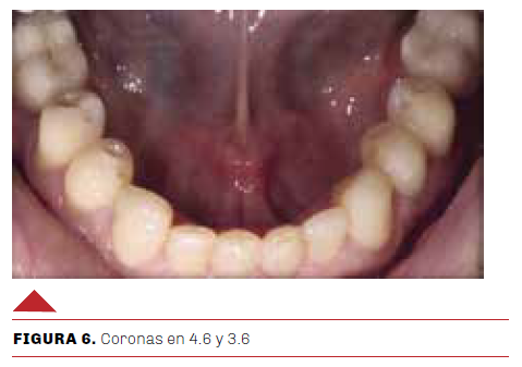 Posteriormente, se procedió a la prueba del pilar personalizado junto con el casquete metálico colado para luego realizar la prueba del bizcochado y finalmente obtener el glaseado del laboratorio (Figura 6). Efectuada dicha prueba se procedió a la fijación de las coronas metalocerámicas con ionómero vítreo convencional (KetacCem, 3M ESPE, St. Paul, MN, USA).
