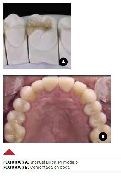 En la pieza dentaria se realizaron procedimientos adhesivos y la incrustación de cerámica, previamente preparada en su superficie interna para la fijación, se cargó el medio en base a resina y se lo llevó al asentamiento pasivo sobre la pieza dentaria, se sostuvo bajo presión y se eliminó el exceso periférico y proximal secuencialmente, se fotopolimerizó por todas las caras, se retiró la goma dique y se hizo un control de los contactos oclusales. El ajuste oclusal se realizó con piedra tronco cónica de diamante de grano fino, se pueden usar tiras de pulir para el exceso proximal, finalizando se alisó la superficie con gomas y pasta de pulido (Figuras 7 A y B).