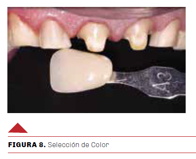 Un paso muy importante es la selección del color, tanto en esmalte como en dentina, ya que es un desafío restaurador lograr una diferencia entre el color inicial del sustrato y el color final deseado. Para la evaluación del color se realizó un mapa cromático. Durante esta evaluación se tomó en cuenta la forma topográfica, la textura de superficie y las caracterizaciones considerando el valor, translucidez, croma y matiz, por el gran facetamiento que presentaba el paciente, se observó el color en incisal y proximal de las piezas dentarias con la escala de color de Vitapan Classical (Figura 8).