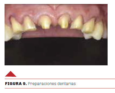 Con los principios restauradores de máxima prevención y preservación y mínimo desgaste de estructuras sanas, se procedió a realizar las preparaciones dentarias para coronas individuales de las piezas 1.1 y 2.1, y preparaciones para carillas de las piezas 1.2, 1.3, 2.2 y 2.3, con una guía de silicona para controlar el desgaste. Estas guías confeccionadas sobre el encerado son herramientas simples e imprescindibles para el control y la preservación en la reducción del esmalte. Dos guías fueron confeccionadas de canino a canino, una guía vertical para el control en sentido cervico incisal y otra horizontal para el control del desgaste en sentido mesio distal con cortes en el tercio incisal, medio y cervical (Figura 9).