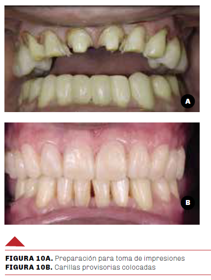 Luego se hizo la toma de registro con el arco facial (Elite, Bio Art) registro intermaxilar y montaje en el articulador semiajustable (A7 Plus, Bio Art), para la provisionalización de las piezas dentarias anteriores se confeccionaron las carillas con resina bis acrílica (Protemp 4, 3M ESPE), se eliminaron excesos y se controló la oclusión (Figuras 10 A y B).