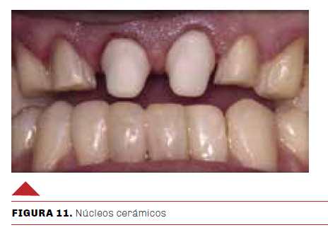 Al regreso del laboratorio, para la prueba de casquetes cerámicos o núcleos semi-opacos de las piezas 1.1 y 2.1, se verificó el ajuste de los casquetes, que tengan una buena adaptación, la terminación gingival en los márgenes, espacio interoclusal y proximal suficiente, se determinó el color de los mismos y se envió al laboratorio para el blindaje y posterior glaseado para la terminación y fijación (Figura 11).