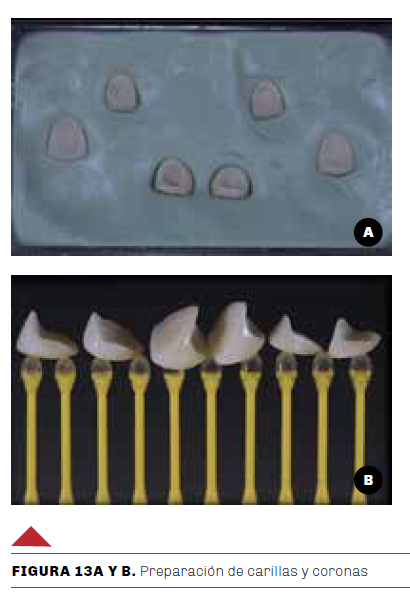 Coronas y carillas de cerámica pura ya preparadas, listas para realizar la prueba del asentamiento pasivo (Figuras 12 A-C). Después de hecha la prueba se tuvo la seguridad de que las carillas y el medio de fijación resinoso seleccionado reproducirán el resultado planificado.
